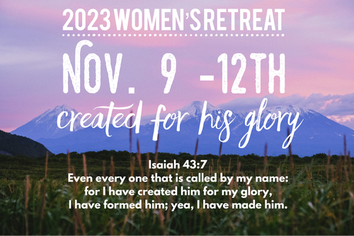 3rd. Payment $30.00+feeThis retreat is for women who desire to grow in their relationship with the Lord Jesus Christ. We will talk about what it means to bring him glory and live for his glory, and we will diligently search the Scriptures to know what "created for his glory” really means. Let’s let Jesus transform us into women who shine as stars in dark places so that the sweet smell and fragrance of salvation will fill every place of our lives.